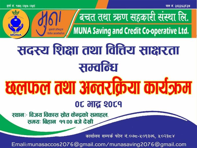 नवलपरासी (ब.सु.पुर्व), ८ भाद्र २०८१ – गैडाकोट स्थित मुना बचत तथा ऋण सहकारी संस्था लिमिटेडको आयोजनामा एक दिने सदस्य शिक्षा तथा वित्तीय साक्षरता सम्बन्धी छलफल तथा अन्तरक्रिया कार्यक्रम सम्पन्न भएको छ। कार्यक्रम विजय विकास स्रोत केन्द्रमा सम्पन्न भएको हो।